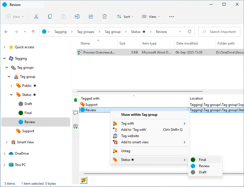 When a tag is selected in the Navigation Pane, the Folder View shows all the tagged (linked) files and folders.